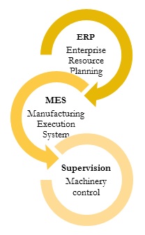 MES/MOM constitutes the link between ERP, which coordinates the full range of the company’s activities, and supervision software, which controls shop floor production equipment.